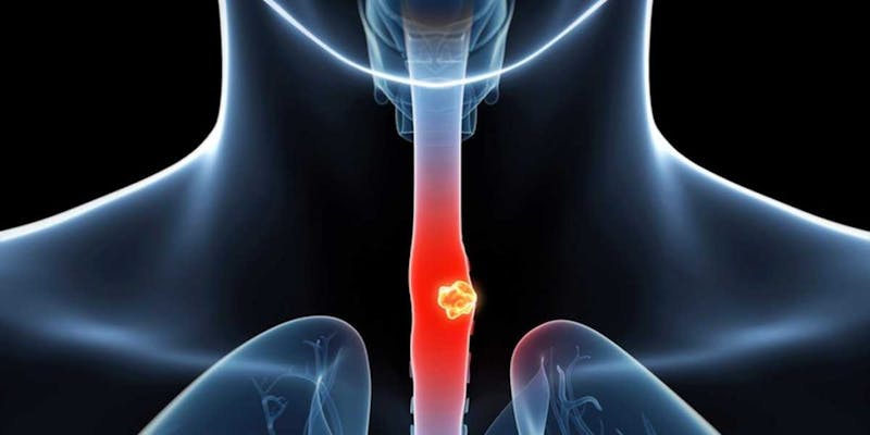 Esophageal cancer occurs when cancer cells develop in the esophagus, a tube-like structure that runs from your throat to your stomach. Food goes from the mouth to the stomach through the esophagus. The cancer starts at the inner layer of the esophagus and can spread throughout the other layers of the esophagus and to other parts of the body (metastasis). There are two main types of esophageal cancer. One type is squamous cell carcinoma. Squamous cells line the inner esophagus, and cancer developing from squamous cells can occur along the entire esophagus. The other type is called Adenocarcinoma. This cancer develops from gland cells. To develop adenocarcinoma of the esophagus, squamous cells that normally line the esophagus are replaced by gland cells. This typically occurs in the lower esophagus near the stomach and is believed to be largely related to acid exposure to the lower esophagus.